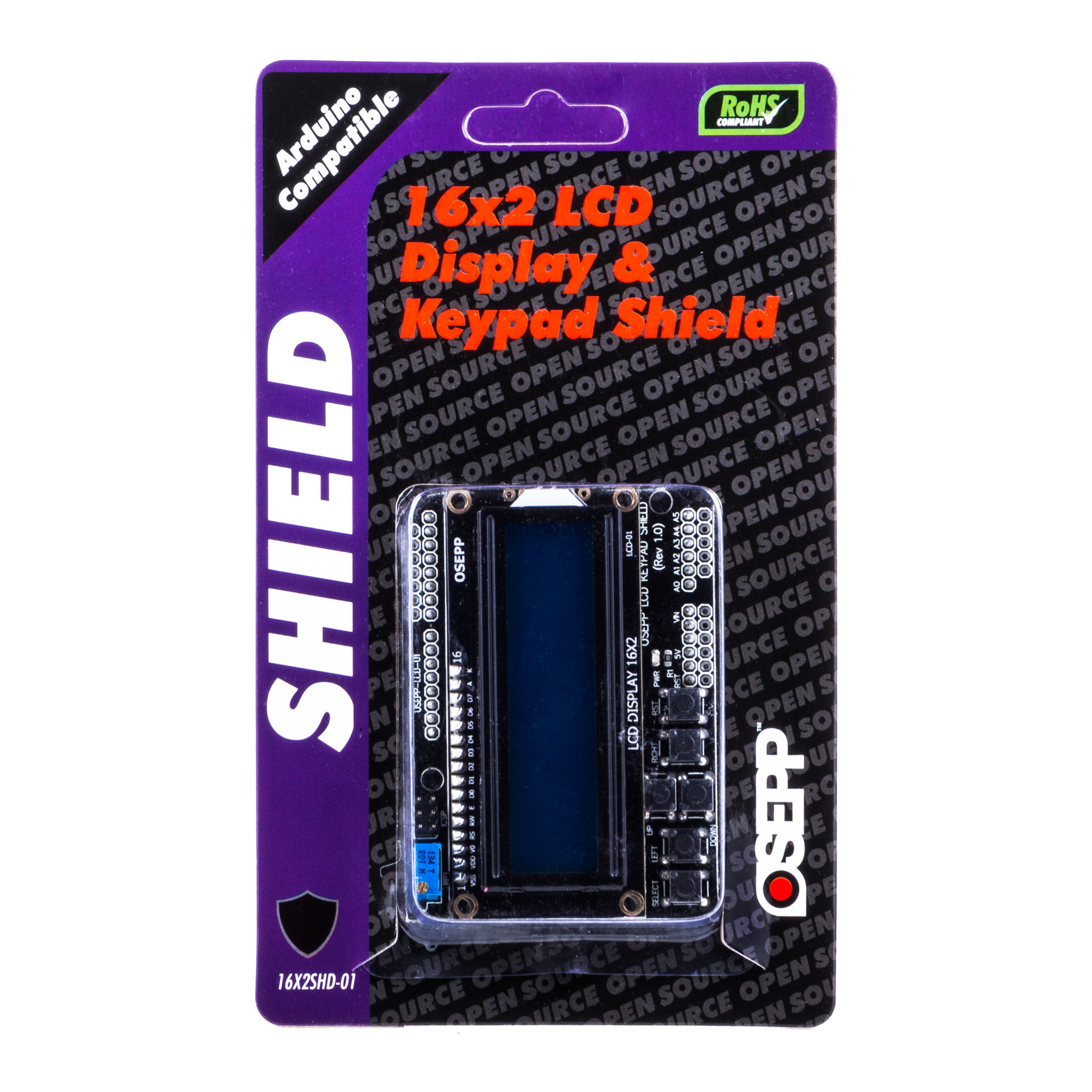 The OSEPP 16 x 2 LCD Display and Keypad shield can plug directly onto the Arduino and Arduino compatible boards. The LCD panel displays characters in white with a blue backlit and can display up to two lines of 16 characters. The shield includes 6 momentary push button that can be used to implement a 5 buttons keypad including up, down, left, right and select function. The sixth push button brings out the Arduino’s reset button to the top of the shield.